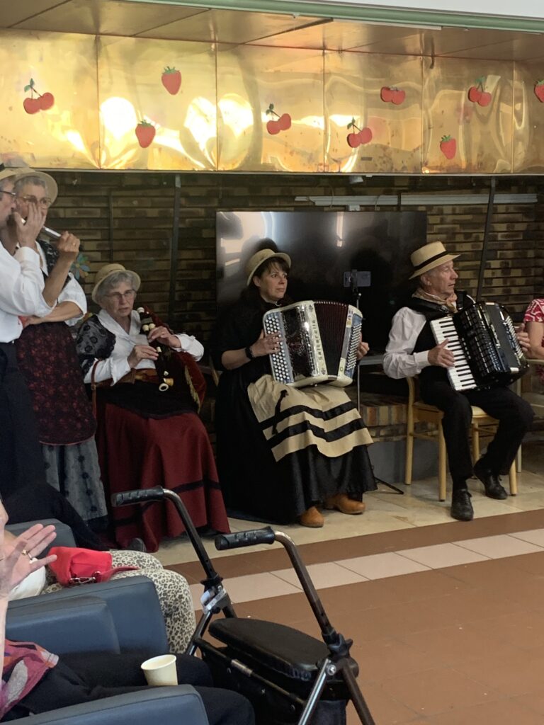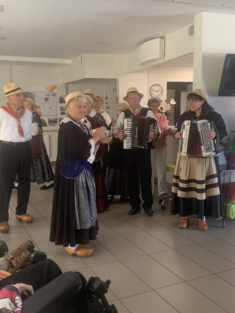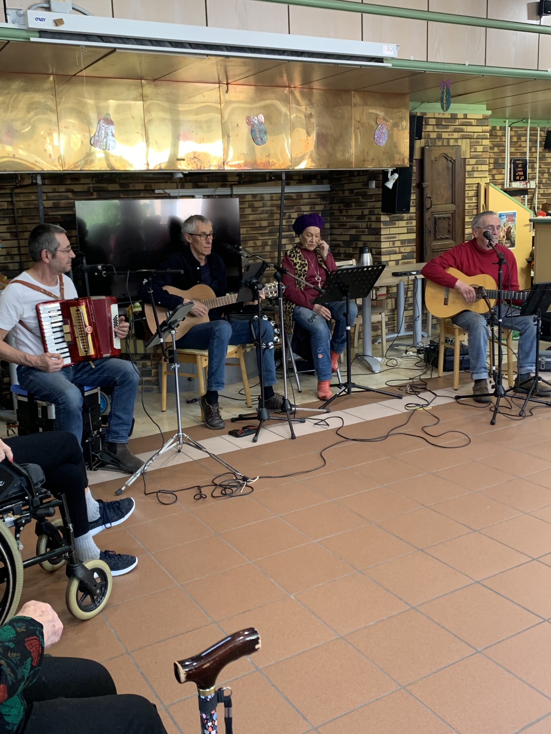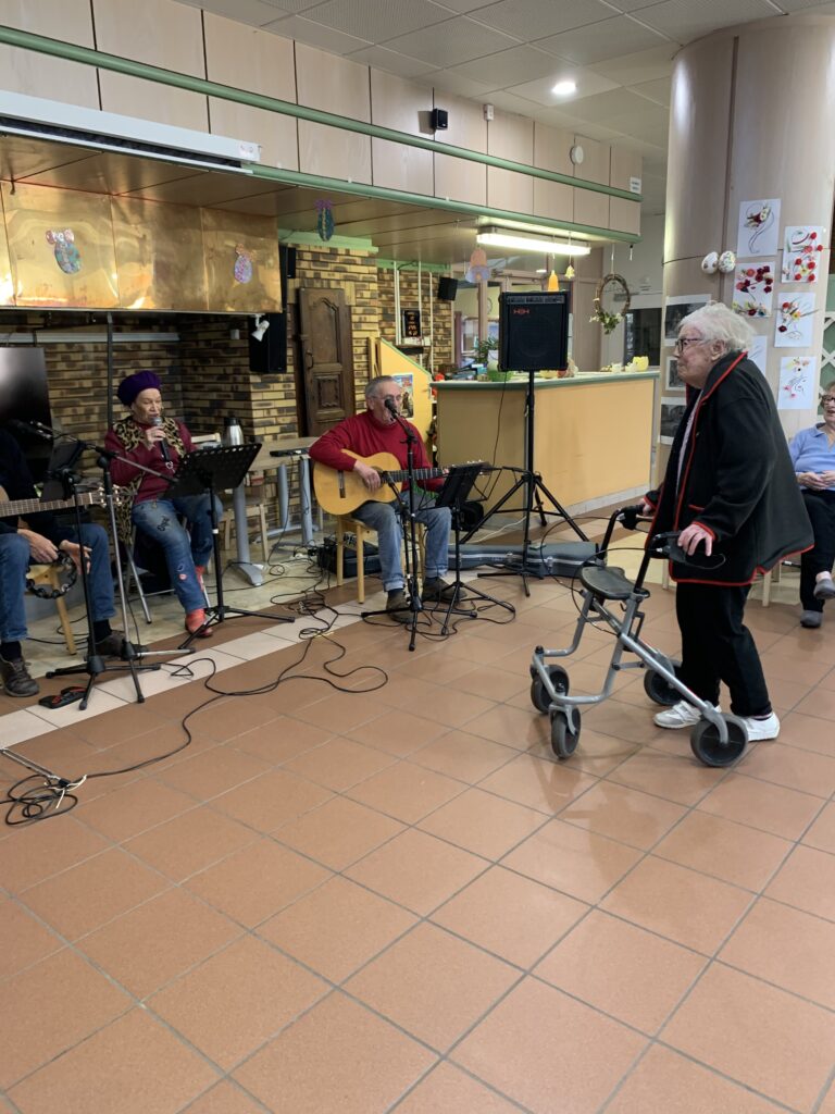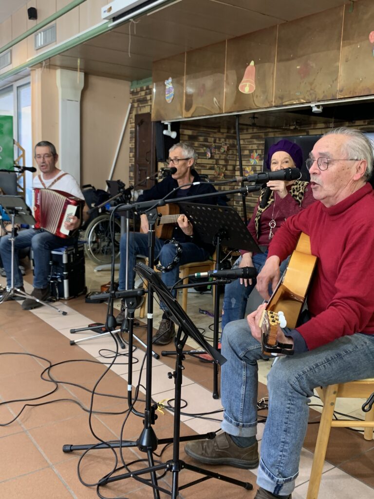 Le mardi 17 mars, le groupe Dajamea, composé de deux guitares, un accordéon et une chanteuse, sont venus donner un concert aux résidents. Magnifique ! Il reviendra en septembre, avec des chansons en l’honneur de la fête du roi de l’oiseau.